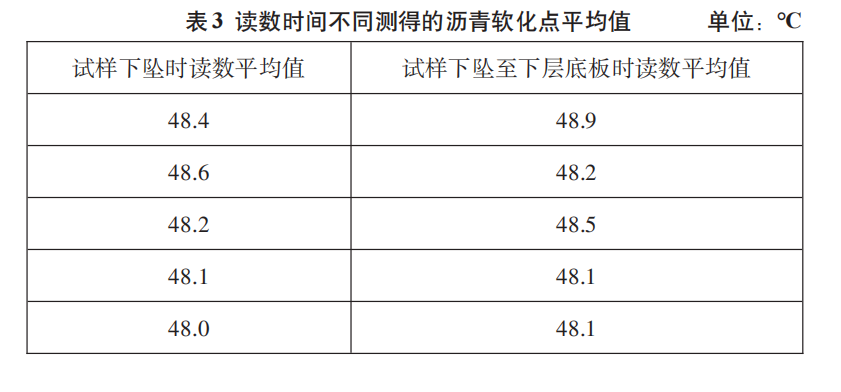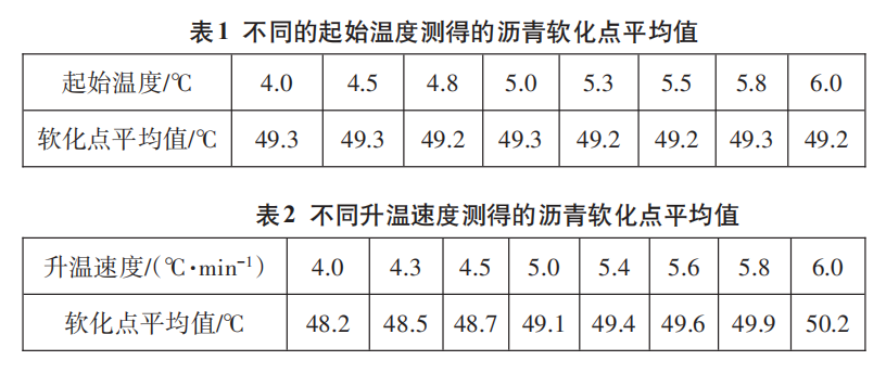 通過(guò)表1可知,黏稠石油瀝青軟化點(diǎn)檢測(cè)過(guò)程中,試驗(yàn)起始溫度對(duì)試驗(yàn)的影響比較小。在當(dāng)起始溫度與規(guī)范規(guī)定