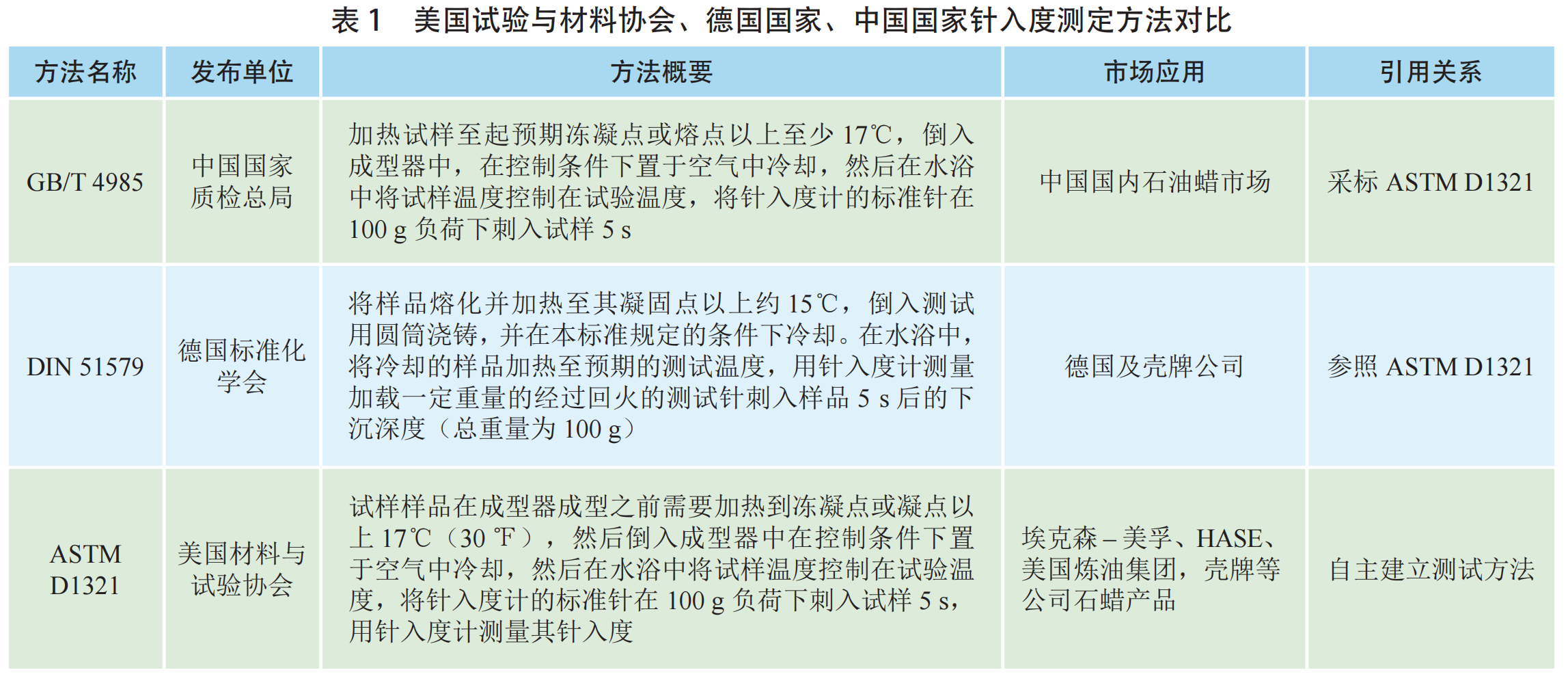 (國際標準化組織ISO采用本標準),以及我國現行的檢測石蠟針入度檢測法GB/T 4985等。如表1中對上述3種試驗方法對比可知,