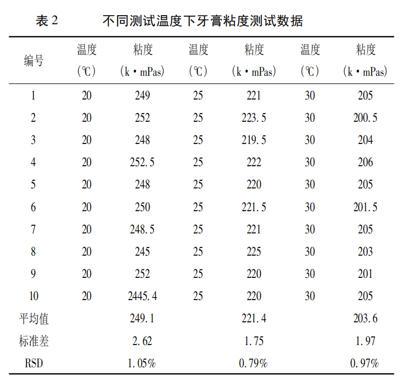 加劇,分子間氫鍵被破壞,分子鏈間的纏結(jié)作用被減弱,牙膏粘度降低,在同一溫度下平行樣之間相對標(biāo)準(zhǔn)差都在 2%以下,所以牙