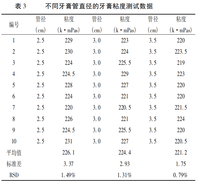 的影響,測試數(shù)據(jù)見表 2。 由表 2 可以看出,管徑越大,牙膏粘度測試數(shù)據(jù)的相對標(biāo)準(zhǔn)差越小,其中 35mm 管徑下測量粘度的精密