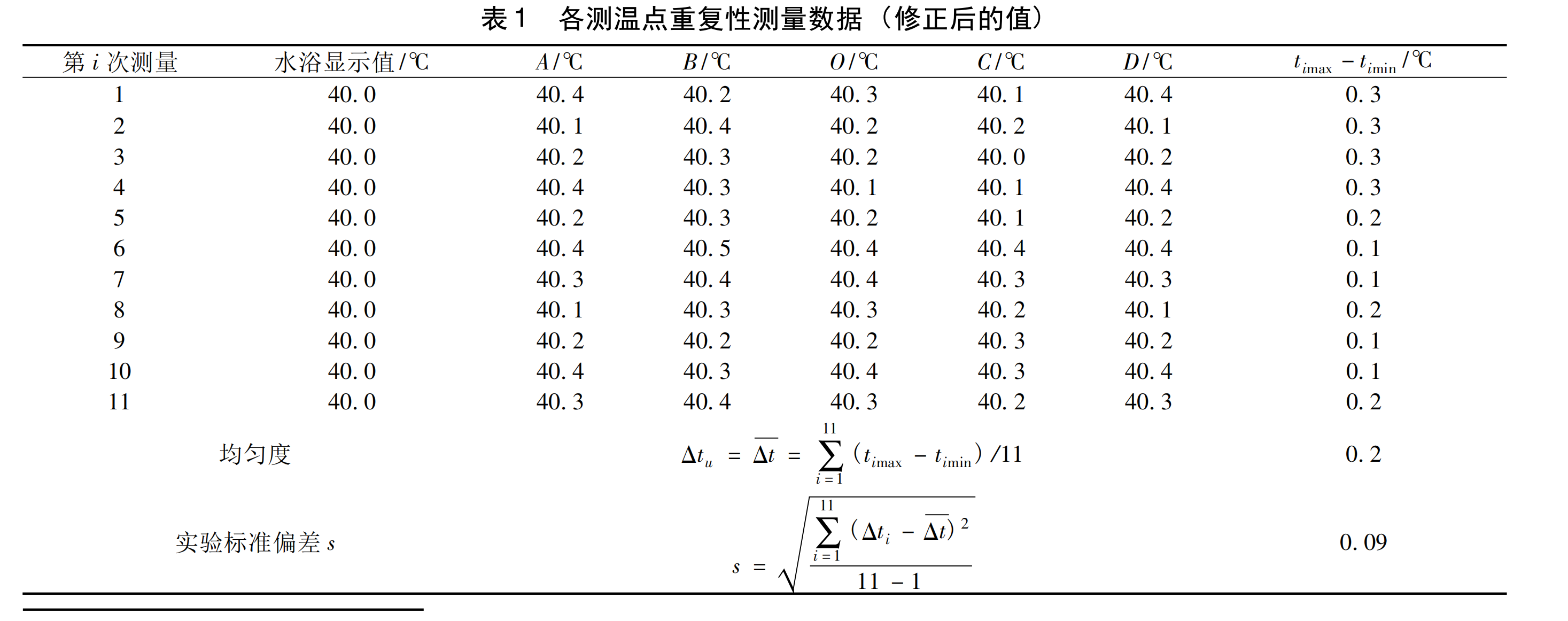 每隔 3 min 測量一次,共計 11 次,記錄各測溫點和水浴顯示的溫度值。每次測試中最高溫度與最低溫度差值的算術平均值即