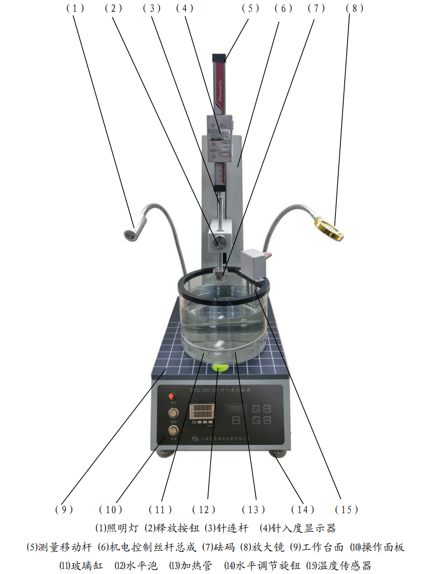 (1)顯示器移動桿與針入度顯示器組成針入度測量裝置,開始使用前,用干燥清潔的軟布擦拭干凈顯示器移動桿的表