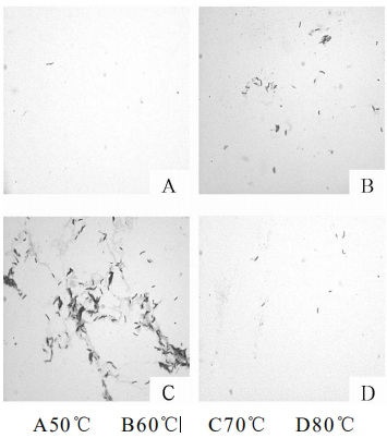 采用恒溫水浴箱加熱法對結核桿菌進行抗酸染色,染色時間為10min,染色溫度分別為50、60、70℃和80℃,染色結果見圖1。圖1結果顯示,70℃恒溫水浴染色(圖1-C)效果良好,菌體形態清晰,色澤明亮;60℃恒溫水浴染色(圖1-B)效果一般,菌體形態可辨,色澤偏暗;50℃和80℃恒溫水浴染色(圖1-A和D)效果差,可辨別的菌體較少,色澤淡染。
