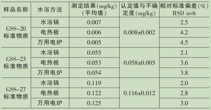 綜上所述,在用水浴法測定土壤中汞時,水浴條件的選擇十分重要,用恒溫水浴鍋進行水浴消解操作簡便,準確度和精密度更高,對低含量水平的土壤樣品尤其具有優勢,在我們的日常實驗室工作中可以推廣。