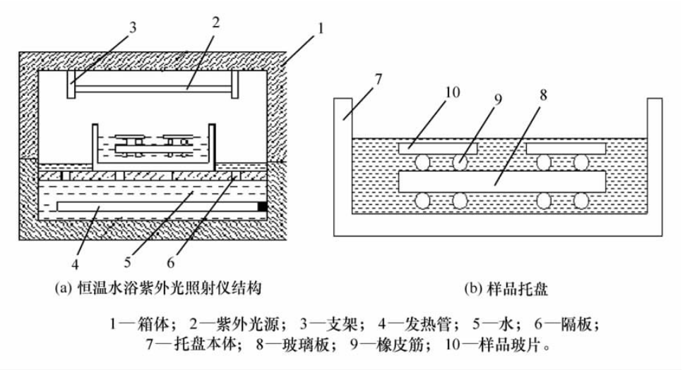 恒溫水浴紫外光照射儀的箱體由不透明材料制成,保證箱體不透光、避免紫外光外泄,對(duì)人體造成傷害。箱體內(nèi)的頂部設(shè)有紫外光發(fā)射裝置,紫外光照射劑量可調(diào)。箱體內(nèi)裝有水,水中設(shè)有發(fā)熱管,對(duì)水進(jìn)行加熱并保持恒溫。樣品托盤包括托盤本體、玻璃板和橡皮筋,托盤本體由耐酸耐堿的防腐材料制成,用于盛載樣品浸液;玻璃板放在托盤本體內(nèi),橡皮筋圈在玻璃板上;每塊樣品玻片分別架在橡皮筋上,這樣使樣品玻片與玻璃板之間有一定間隙,方便樣品玻片的取出。托盤本體和樣品玻片放置在紫外光裝置的下方、隔板的上面,隔板有孔,使水充分地接觸樣品托盤底部,更好地實(shí)現(xiàn)恒溫水浴的效果;托盤本體底部與紫外光裝置需要保持一定距離,以確保紫外光能夠均勻照射到樣品托盤上。