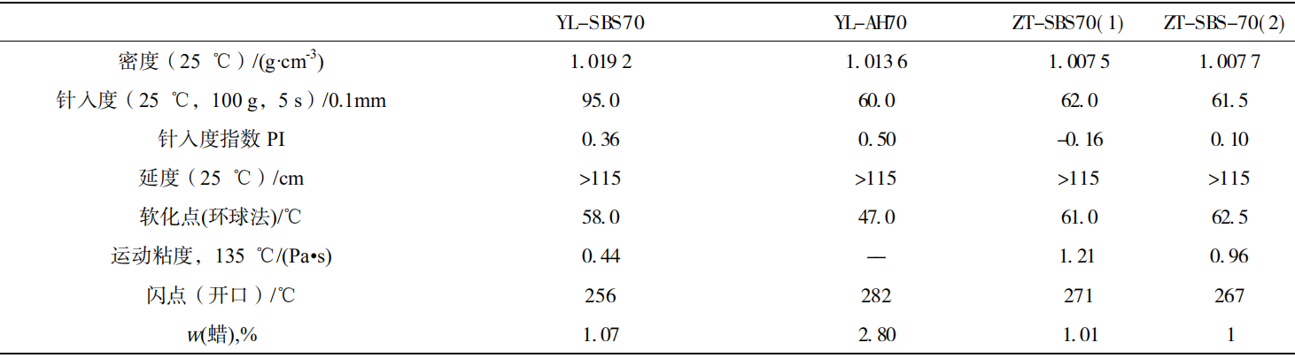 YL-SBS70,YL-AH70,ZT-SBS70(1),ZT-SBS-70。4種瀝青原料性質(zhì)如表1。